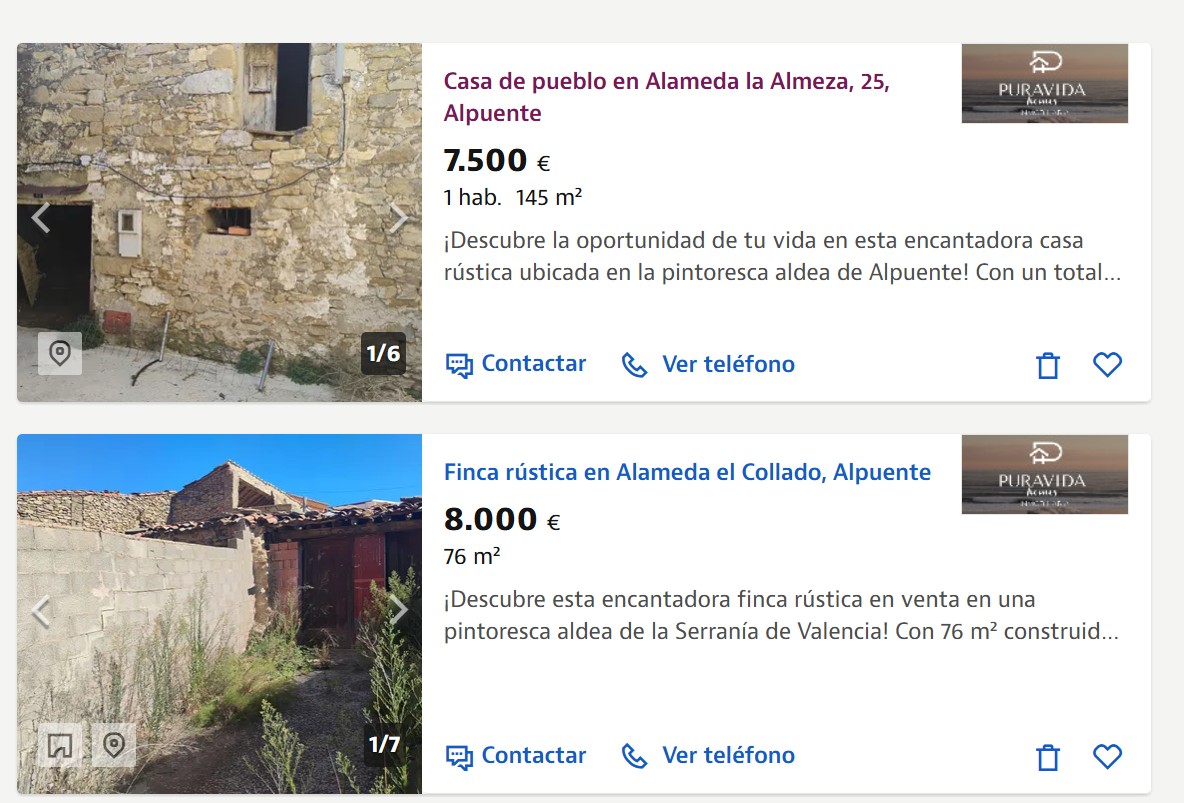 El mercado en Alpuente es de contrastes. Entre los 15.000 y los 50.000 euros existe un amplio abanico de casas de pueblo y antiguos pajares en zonas como Baldovar o La Canaleja. Por ejemplo, por 20.000 euros se vende una casa para rehabilitar con amplio solar a solo 2 km del núcleo urbano, y por 32.000 euros un antiguo caserón de 1930 esquinero que pide a gritos una segunda oportunidad.