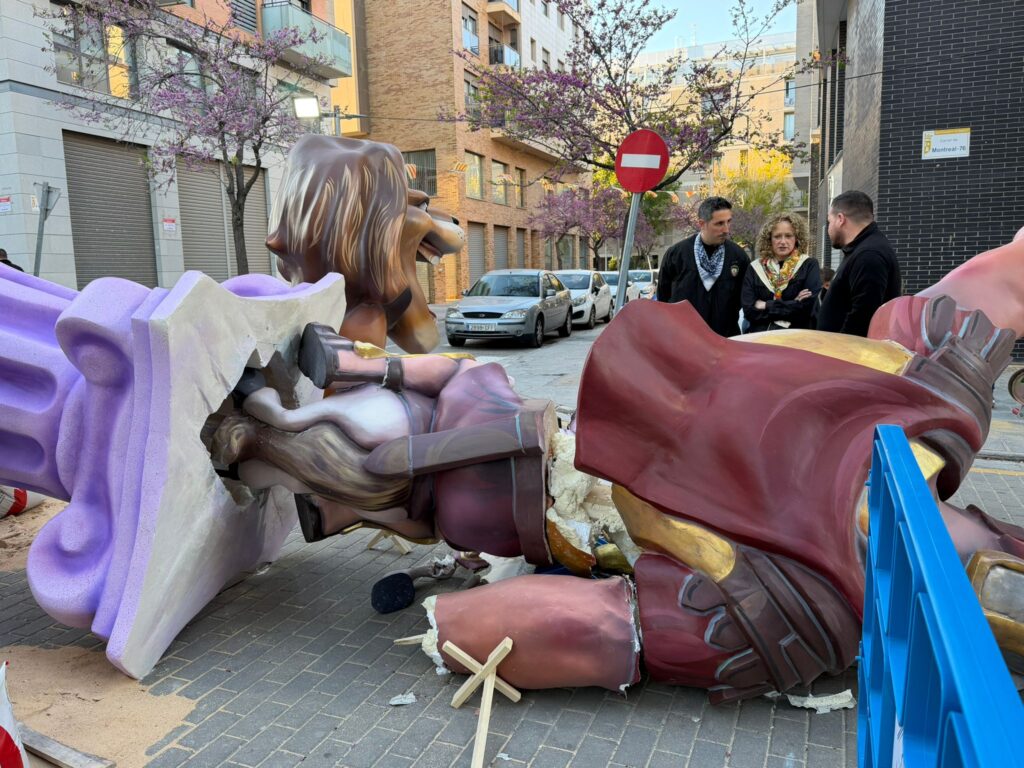 La alerta amarilla por viento ha cumplido sus peores pronósticos en Torrent. La comisión Escultor Vicente Pallardó, ubicada en la zona del Parc Central, ha sufrido esta tarde un duro revés al ver cómo el elemento principal de su falla grande cedía ante la fuerza del aire y acababa desplomado sobre el asfalto.