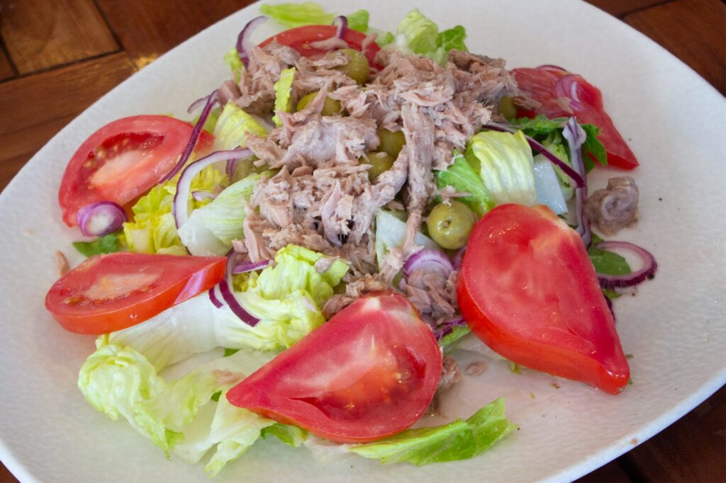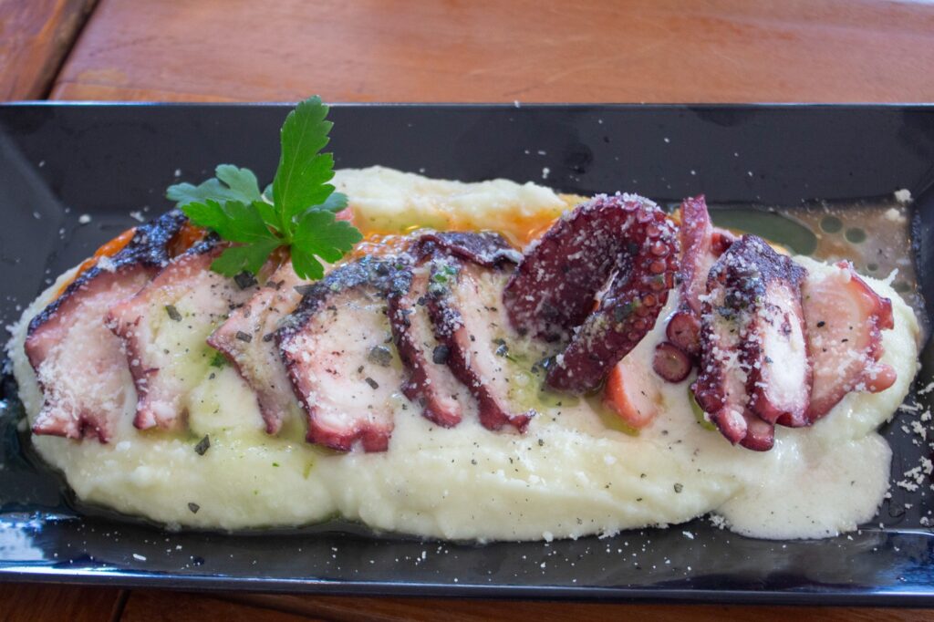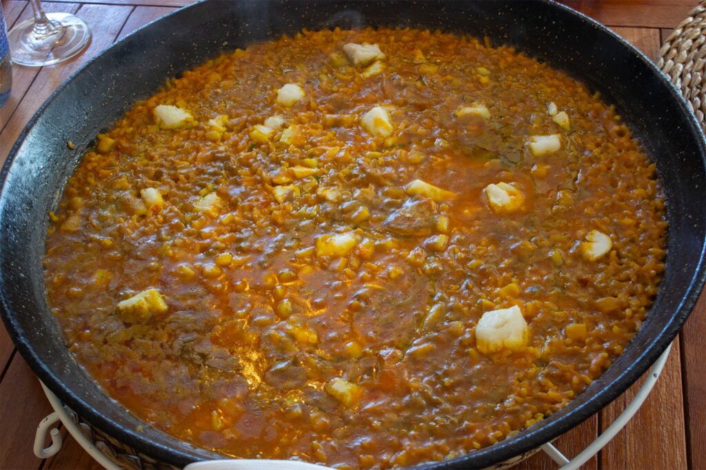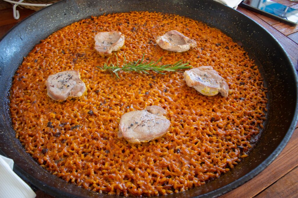 Paralelamente, este acercamiento lo recoge también su gastronomía, platos como su paseo por el Mediterráneo (patatas y boniato con tres salsas), la mousaka, patatas con Salsa Tzatziki o el Saganaki (queso feta envuelto en hojaldre y miel), la ensalada capresse, la ensalada griega o la horiatiki (ensalada de Santorini), comparten carta con platos elaborados con productos de la costa valenciana (clóchinas, tellinas o puntillas) y con un amplio listado de arroces, como la paella valenciana, el arroz del senyoret, el arroz negro de sepia sucia, la paella de la Albufera (que incorpora también pato) y algunos de autor como el Magret de pato, espárragos, mix de boletus y foie gras, el de calabaza y bacalao o el sobrasada con solomillo de cerdo con ralladura de chocolate.