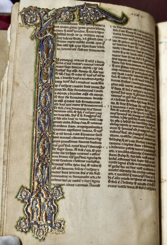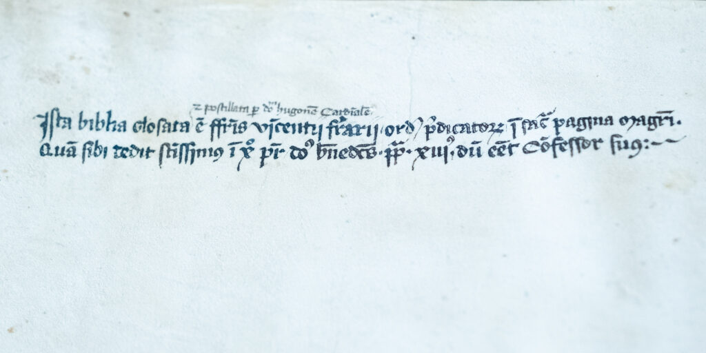 Incluye además la glosa del cardenal Hugo de Santo Caro, un comentario exegético que acompaña al texto y convierte cada página en un espacio de interpretación compleja.