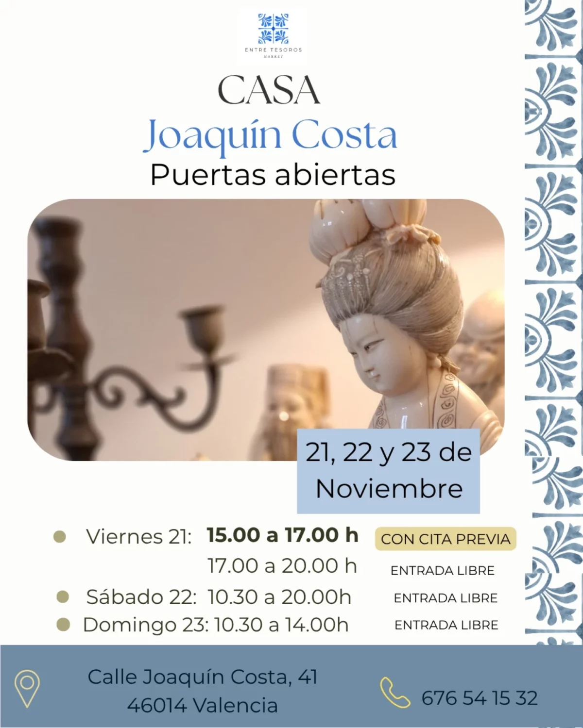 Detrás de esta convocatoria está Entre Tesoros Market, un colectivo que organiza citas de venta directa de antigüedades. En este caso, la venta de puertas abiertas será los próximos 21, 22 y 23 de noviembre.