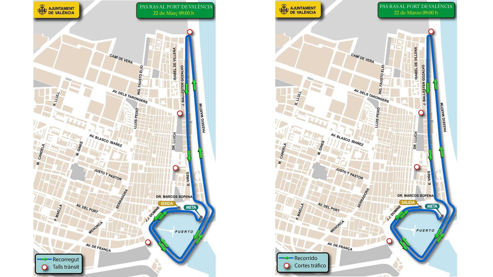 Para garantizar la seguridad de los participantes, el Ayuntamiento de Valencia ha establecido restricciones de aparcamiento. Estará prohibido estacionar desde las 22:00 horas del sábado 21 hasta las 11:00 horas del domingo 22 en los siguientes puntos: