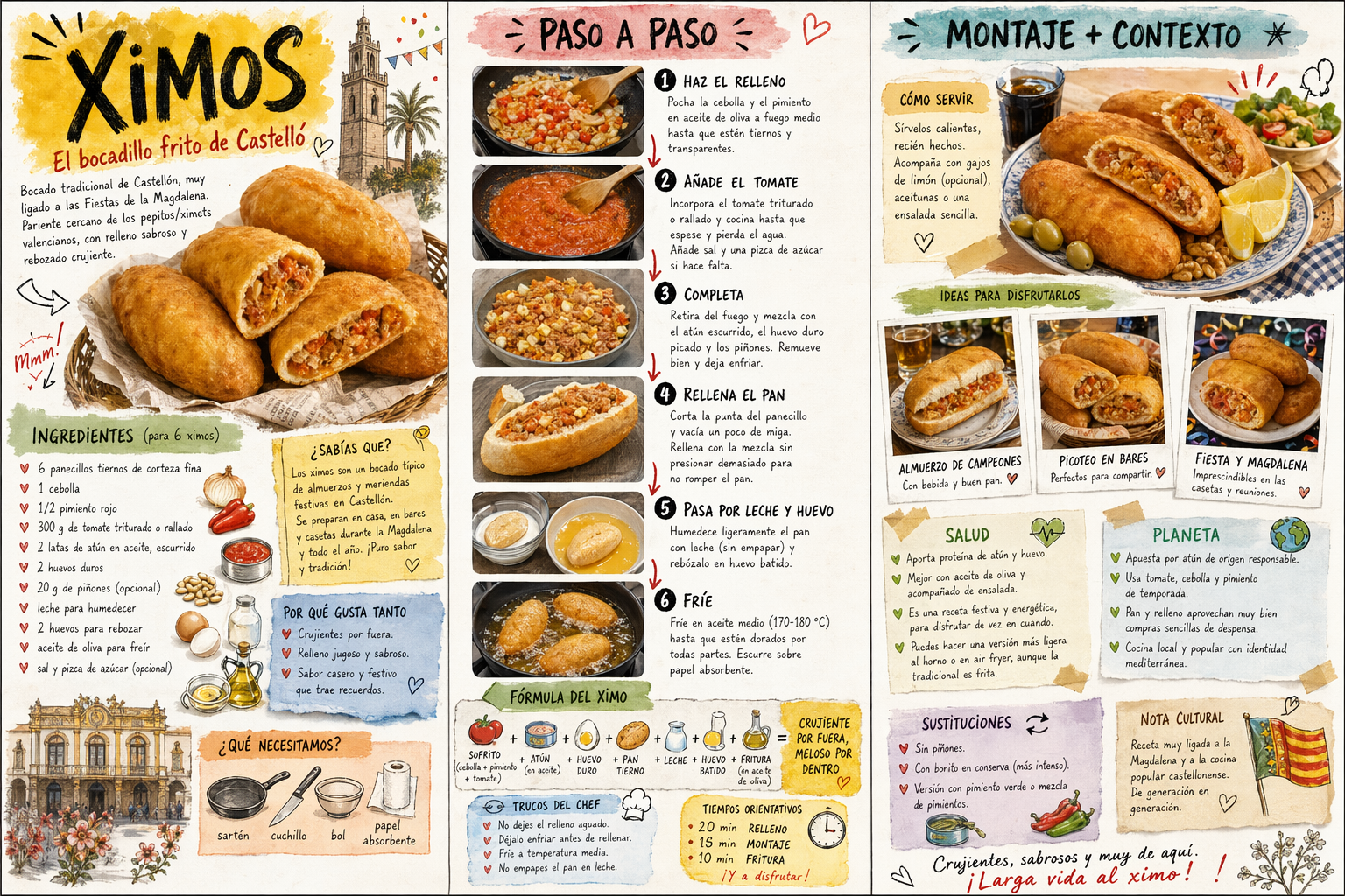 ¿Almuerzo, comida o cena? Los ximos son el comodín perfecto de la gastronomía castellonense. Prepara este bocado tradicional para 4 personas en solo 35 minutos y descubre por qué esta joya de la Magdalena es la reina de las excursiones y celebraciones.
